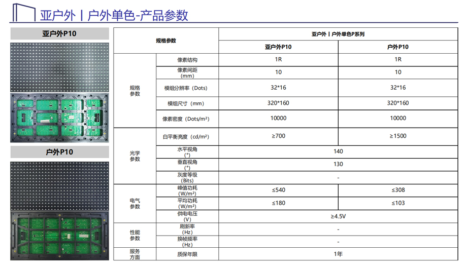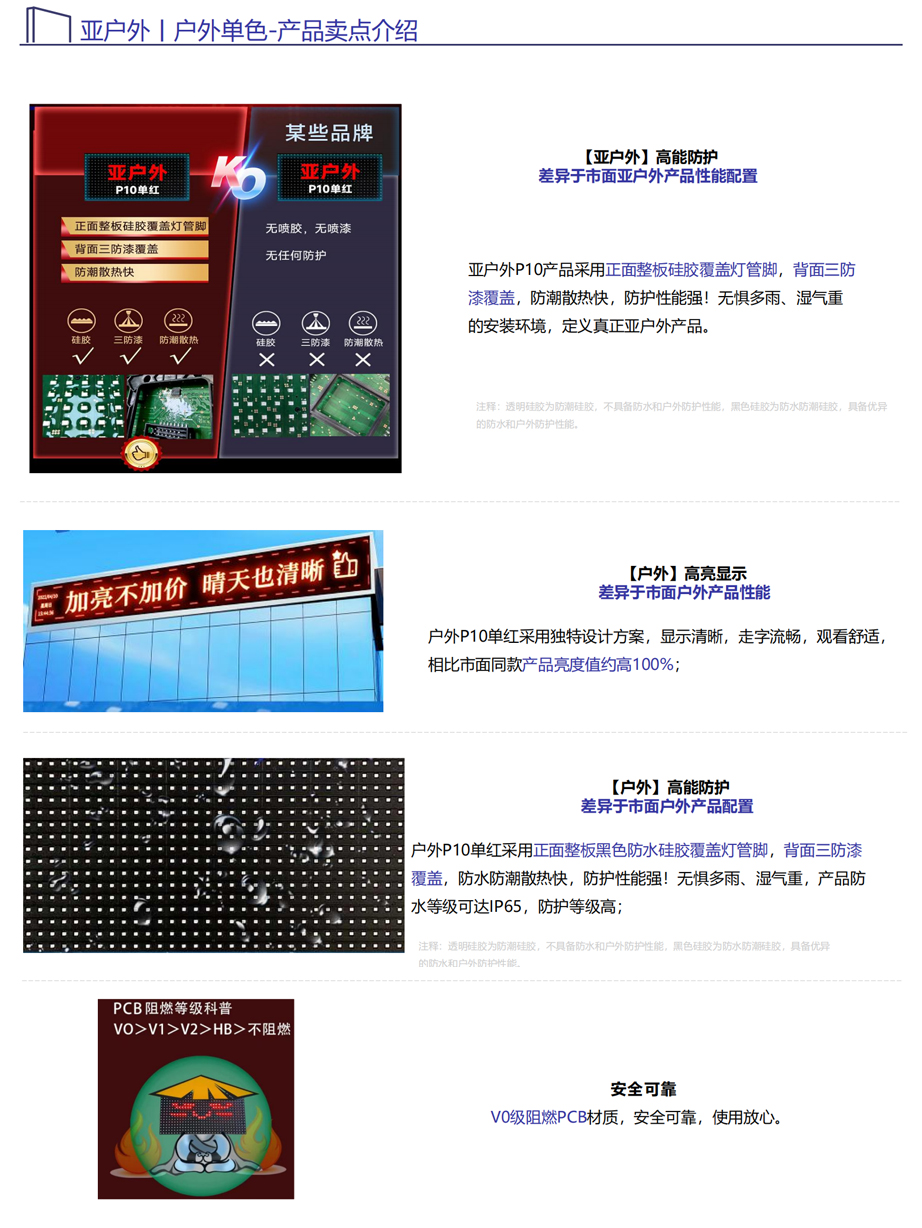针对客户的痛点,公司重新对亚户外表贴P10单红产品和户外P10表贴产品进行定义,采用差异于市面产品性能配置,以更高性价比满足市场需求,包括:①户外高达1500cd/m²的显示亮度(很好的显示效果)②亚户外喷胶和喷三防漆防护(很好的防潮性能);③V0级别阻燃PCB配置(很好的安全性能),让大家更好的满足市场需求。