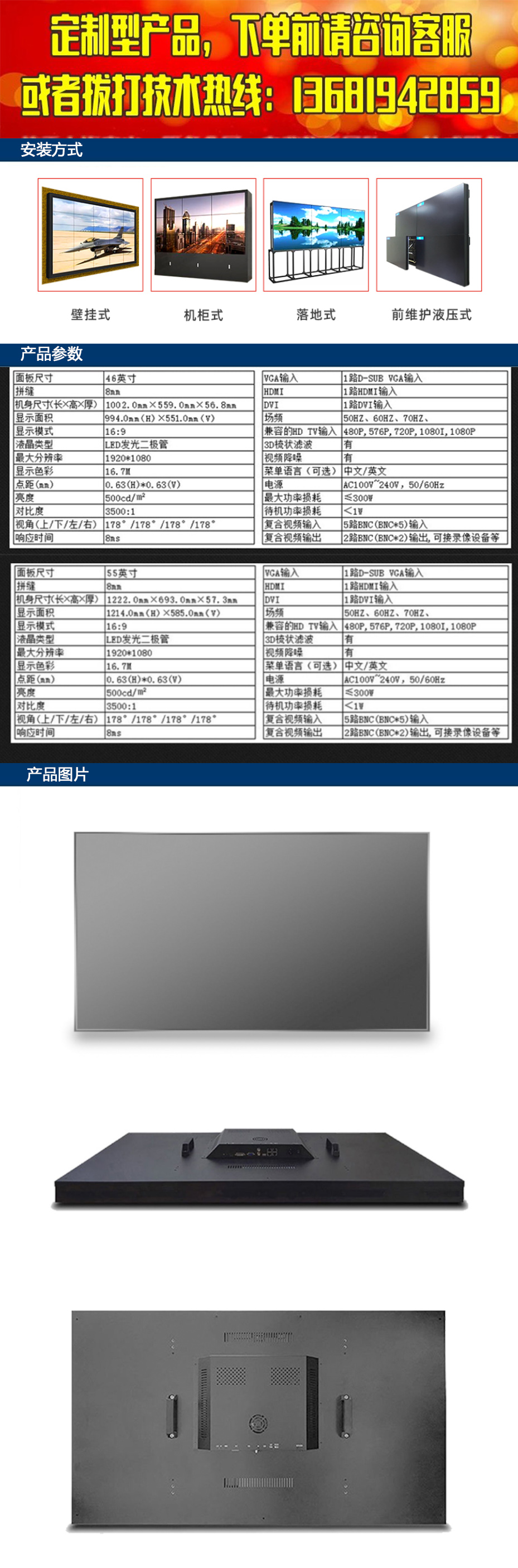 8种规格:有40寸43寸46寸49寸50寸55寸65寸75寸,不同尺寸的规格横着屏竖着拼,想怎么拼就怎么拼