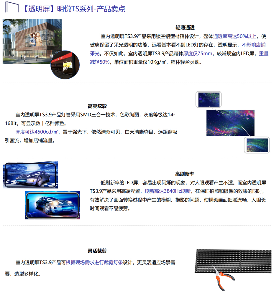 为更好的普及LED显示屏,给客户和用户带来全新的视觉感受和应用体验,公司特发布明悦系列,满足终端客户对透明屏和格栅屏产品的需求,轻松打造通透、立体的大屏。