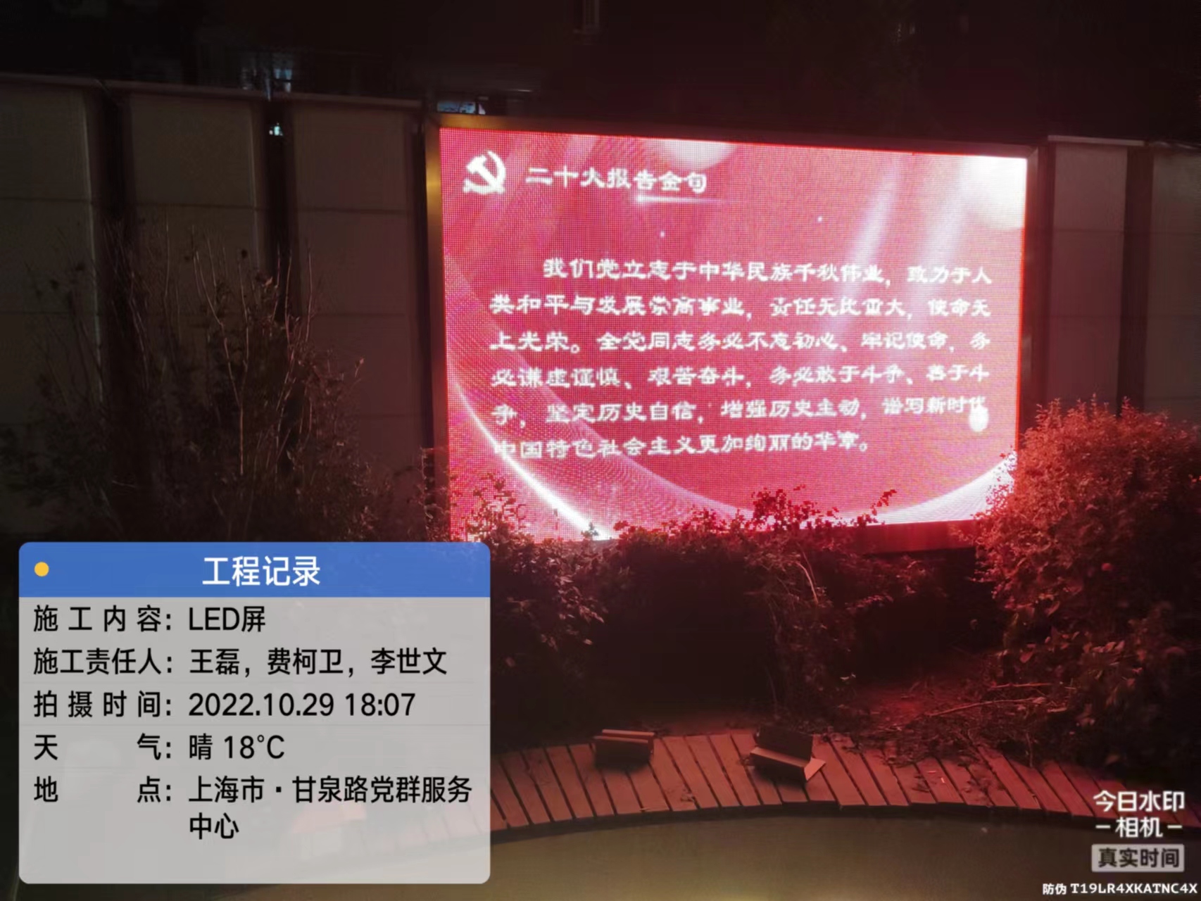 该项目位于普陀区宜川路600号甘泉路街道社区党群服务中心,产品规格为P8室外全彩LED显示屏,长度约2.5米,高度约1.6米,于2022年10月完工。