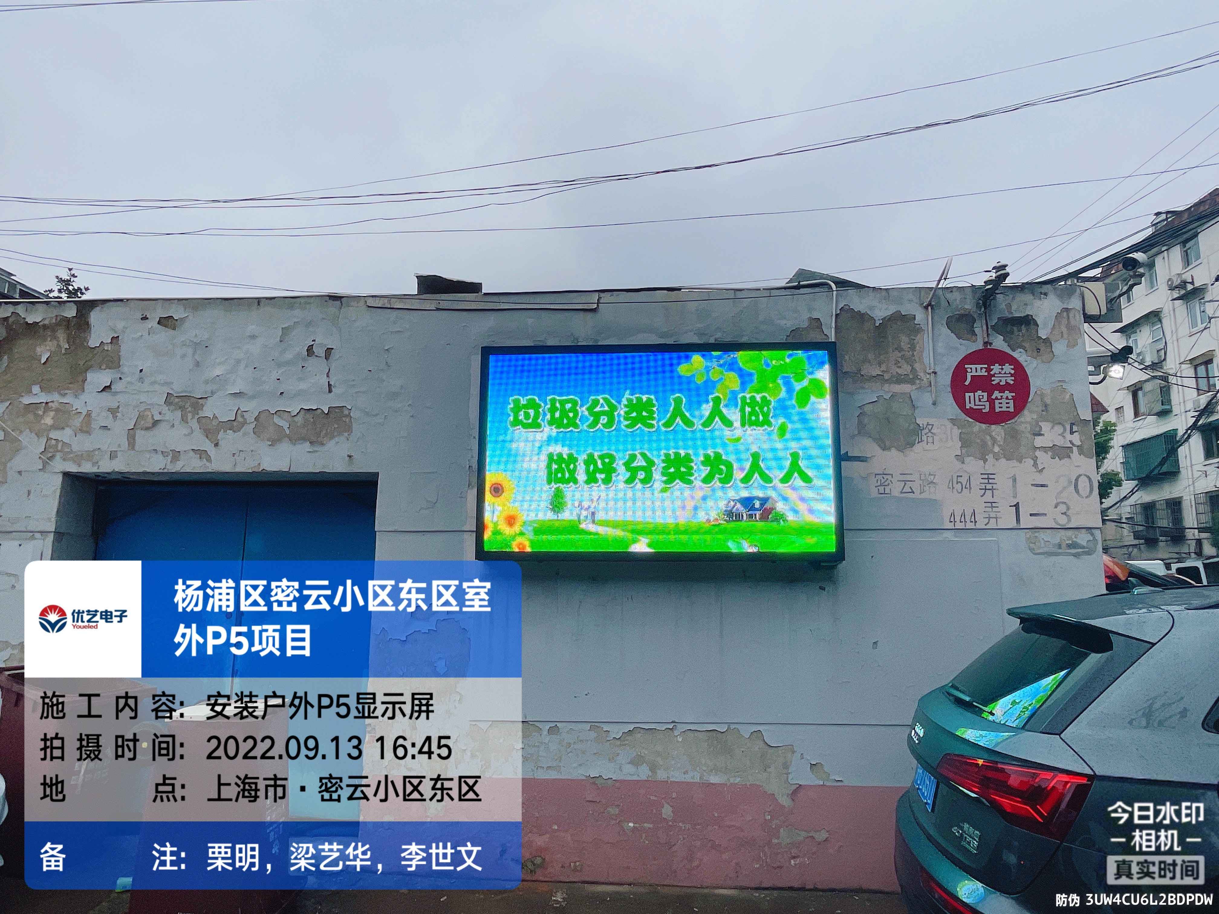 该项目位于上海市杨浦区密云路444弄小区,产品规格为P5室外全彩LED显示屏,长度约2米,高度约1米,于2022年9月完工。